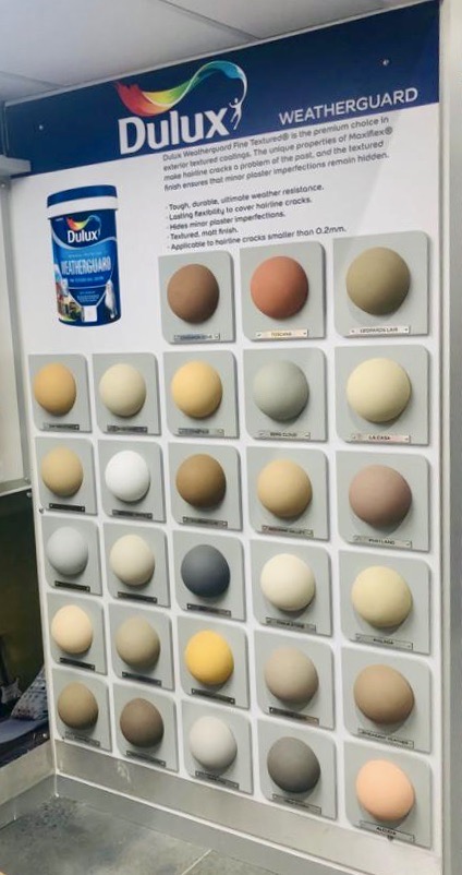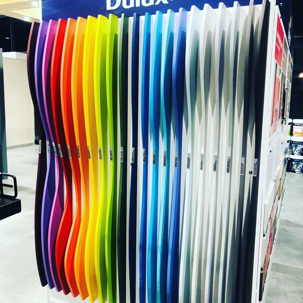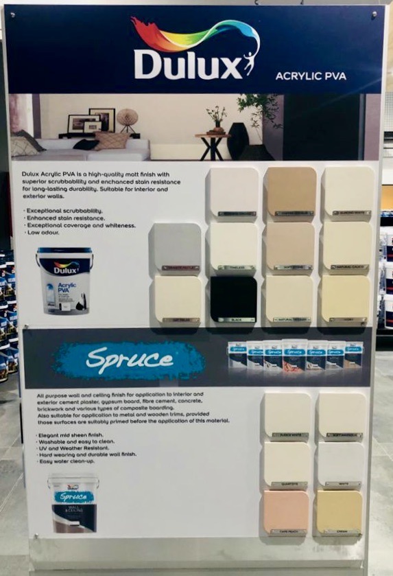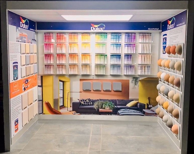 September 2021 saw us appreciating the final installation of our recent work completed for Dulux, in Lifestyle Mall, Gabarone, Botswana. Among other items included in this job was a colour booth; including a 3D spherical display of colour samples to the right of the booth, a colour card display in the centre, further paint samples with information to the left as well as printed vinyls containing information for the customer. Further products provided include our very own, exclusively designed and unique, 3 dimensional wave colour wall. Even the pictures make us want to reach out and touch it! All measurements for the store were taken by ourselves, to ensure accuracy, before production and shipping of all of these elements from our factory in Pomona to Botswana. The installation was completed by a third-party.